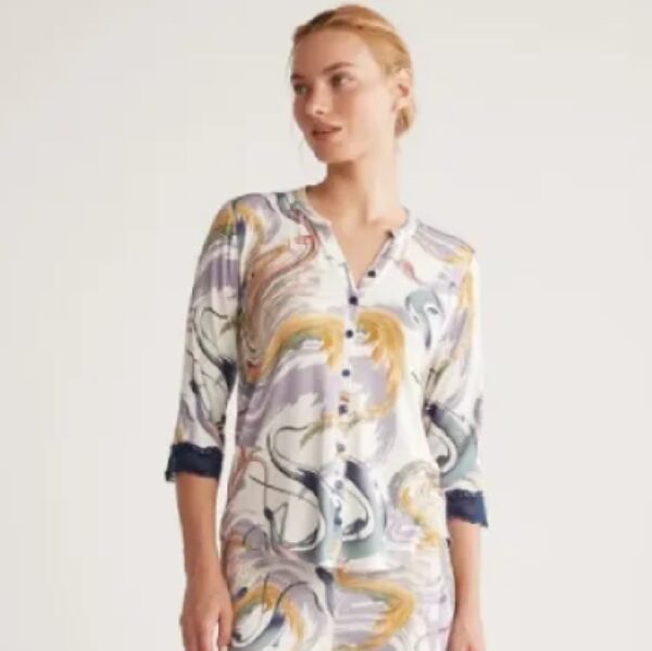 Εμπριμέ χρώμα και δαντελένιο τελείωμα στα μανίκια.