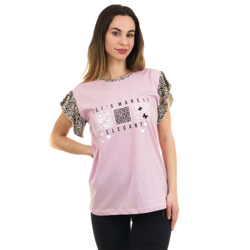 - Μπλούζα σε ρόζ χρώμα με σχέδιο με κοντό μανίκι και στρογγυλή λαιμόκοψη.