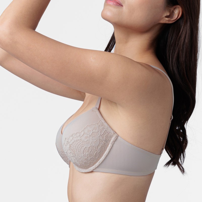 - Το μπεζ σουτιέν είναι με σχέδιο δαντέλας.
